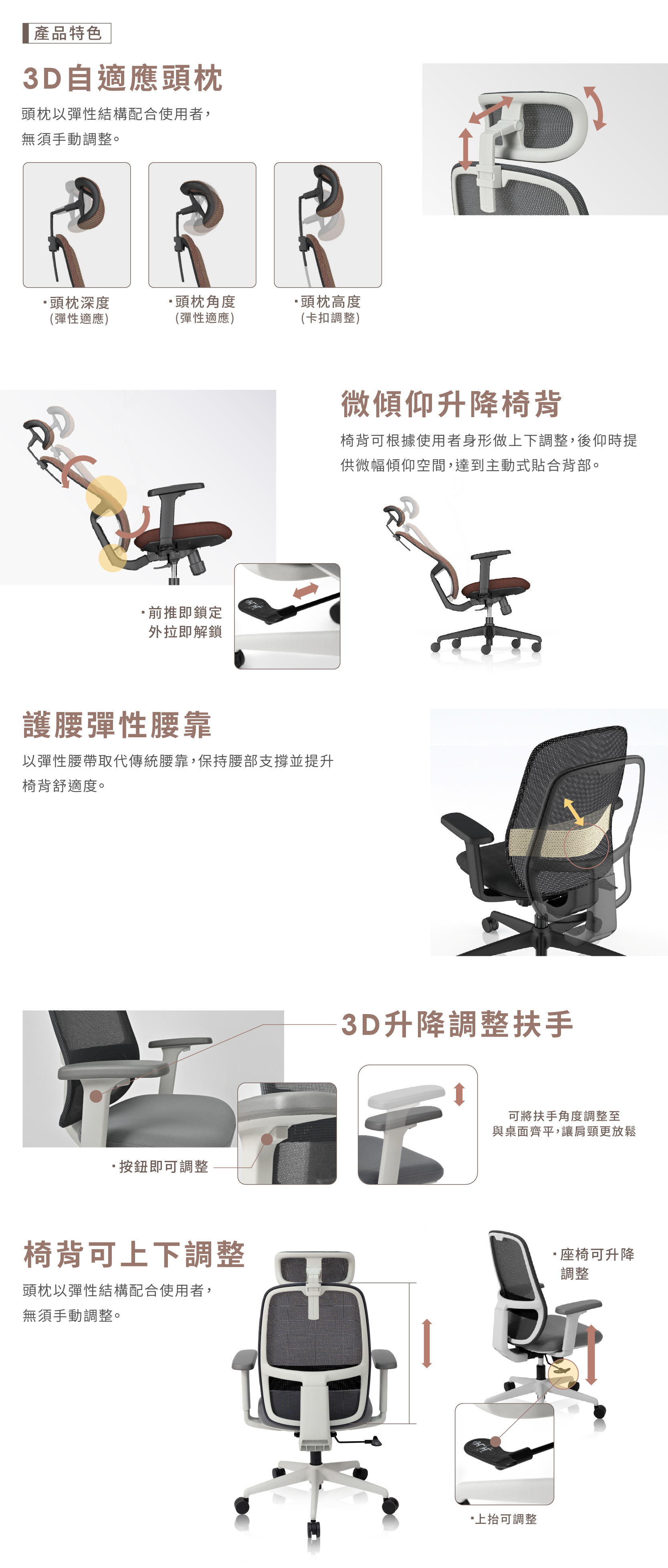 ● 3D彈性自調節頭枕